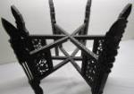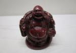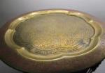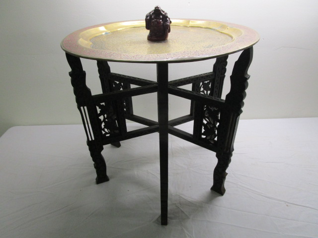 vintage Middle Eastern or Asian-inspired brass tray table featuring an ornate, removable brass top. And 4-in carved chalkware Buddha painted red. The brass tray has intricate carving and some faded coloring and is set on a collapsible carved wooden base. The brass tray measures 22 1/2 in in diameter and stands 21 inches on the base. Very nice collection in very good condition, please preview.
