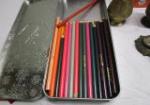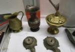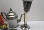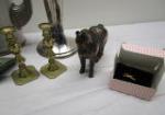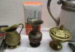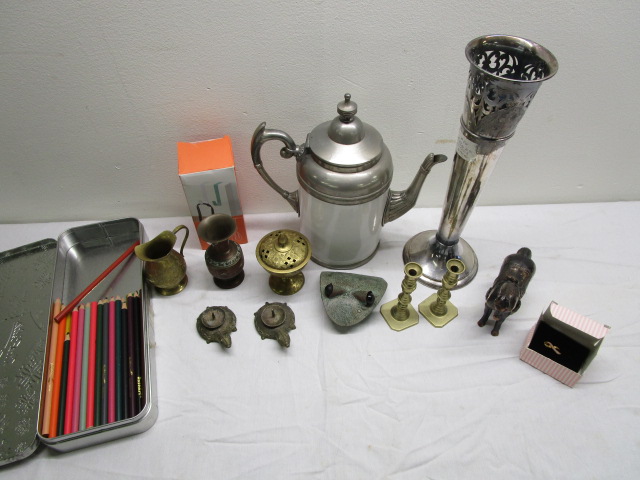Enameled Teapot with Pewter, Brass Mini pitcher, Vase, candlesticks and incense burner, Tall plated vase by Wilcox, Copper tone metal horse figurine, Interesting Turtle shape candle holders, Frog decor w/ marble eyes, metal hooks and tin of colored pencils. Conditions and sizes very, please preview.