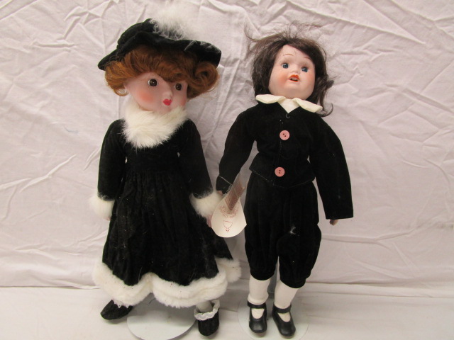 This pair of Heritage collectible dolls feature matching Black Velvet outfits, one boy one girl. Each doll comes with a stand and the girls cuffs on her sleeves are made from real fur, her skirt bottom is faux fur as well. Her neck is also lined in real fur. There is a feather on her hat and each doll measures approximately 16 to 17 inches tall. Good display condition, Please preview.