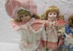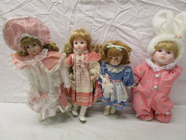 This sweet assortment of four Brinn collectible porcelain dolls features a musical doll, the Alice In Wonderland doll, the "Daisy" doll and the porcelain "Faced" Bunny doll. These dolls are in previously owned, good condition. Please preview.