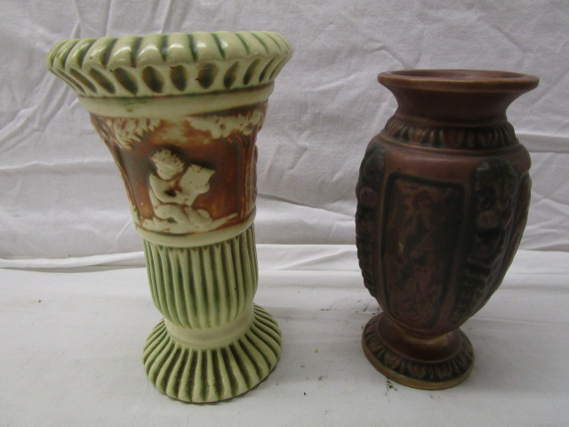 This pair of vintage vases includes a 6" Roseville Pottery vase from the Donatello line and a 5" Roseville "Florentine" vase. These vases are in previously owned, good condition. Please preview.