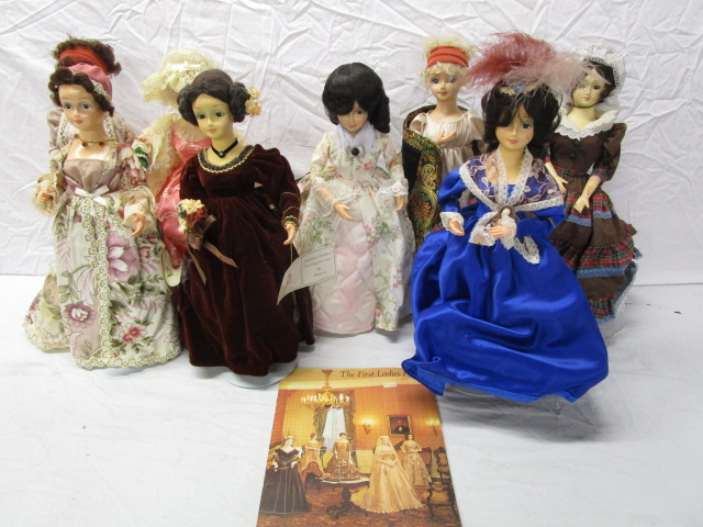 This darling selection of seven vintage collectible Brinn's American Tradition (First Ladies series) dolls includes Martha Washington, Jane Findlay, Elizabeth Monroe and more. Each doll is displayed on a stand. These items are in previously owned, good condition. Please preview.