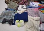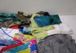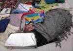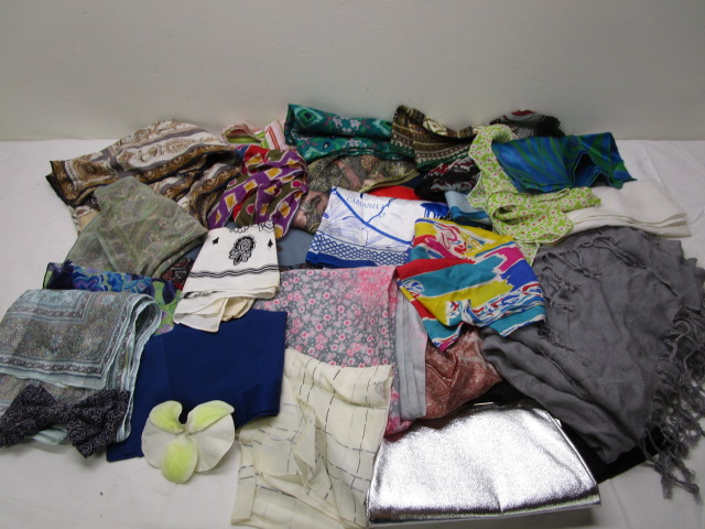 This lovely selection of accessories includes over twenty scarves, a shawl, a cloth hair bow and a silver clutch. purse. These items are in previously owned, good condition. Please preview.