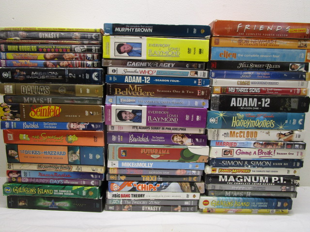 This collection of 55 DVDs/DVD sets features a variety of television series including "Seinfeld", "Mash", "Adam-12" and more. These DVDs are in previously owned, good condition. Please preview.