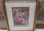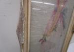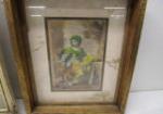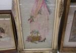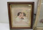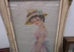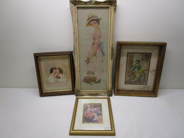 This lovely collection of four pieces of vintage wall art includes a 10" X 12" antique Victorian print featuring two young girls kissing, a 9" X 11" framed print of Michelangelo's fresco "The Erythraean Sibyl", a 11-3/4" X 14-3/4" framed hand colored print of a seated woman, and a 9-1/2" X 24" framed needlepoint work (likely from the 1960's) depicting a young woman in a pink dress. The needle point piece does have some wear to the frame. Other pieces are in previously owned condition. Please preview.
