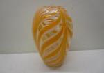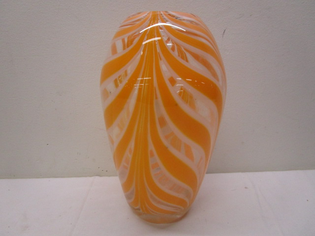 This beautiful Mid century Modern 10-1/2" Murano style orange and white vase features a "ribbon" pattern. This item is in previously owned, good condition. Please preview.