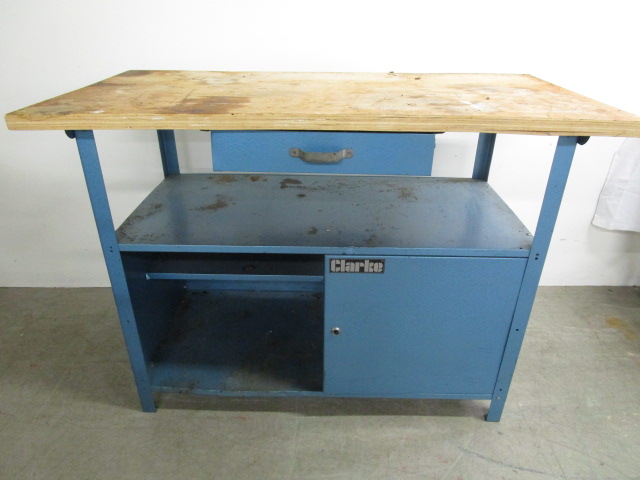 This Clarke (model # CWB1250) Heavy Duty Workbench features an extra thick wooden worktop, a central drawer and two shelves. These items are in previously owned condition. This item has some wear from use and is missing a door. Please preview.