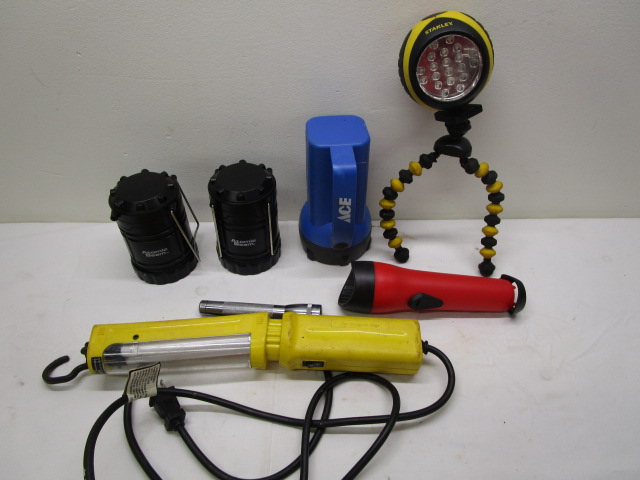 Assorted flashlights, lanterns and work lights. Batteries needed, all appear in good condition. Please preview.