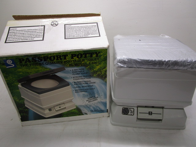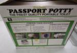 New in Open Box, Passport Potty, Fine Quality Portable Toilet, 8L, Model #6001. Features two section portable flush toilet, strong durable construction, bi-directional piston pump rinse, level indicator and smooth and easy discharge. Sample deodorizer included. Boxes opened but unit never used. Please preview.