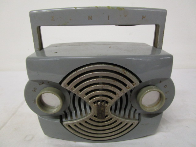 1953 Zenith "Owl Eyes" portable tube radio, specifically the model K412-G in Dawn Grey. There is electric tape on the plug wire at the console piece the radio shows age, please preview. Measures approximately 7 in by four and a half inches by 4 in.