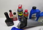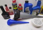 Assorted automobile fluid with funnels and WD40 Lubricant sprays. The majority are full to near full, some used. Please preview.