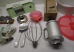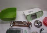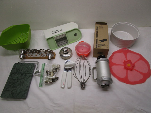 Collection of Kitchen Gadgets, Pampered Chef and Others. Features Vidalia chop wizard, Pampered Chef valtropia bread tube heart, cookie press with assorted designs, countertop blender whisk, frosting tips, and others. Very good too excellent previously owned condition, please preview.