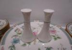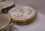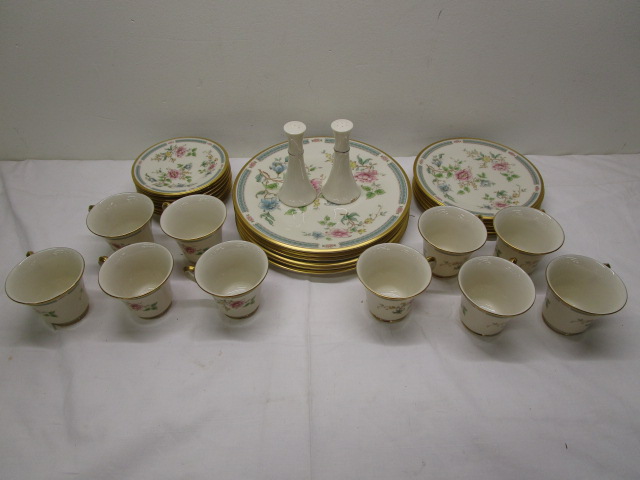Gorgeous Lennox Morning Blossom China dish set. 33 pieces in all. Beautiful pink and blue floral pattern with gold trimming throughout. The set includes six 10-in dinner plates, 9 saucers with 10 teacups and six 8-in salad plates. Comes with an ivory set of shakers with a platinum trim, not gold. They are also Lenox. The set is in overall very good previously owned condition with no visual chips or cracks or crazing in the glazing. Please preview.