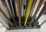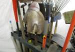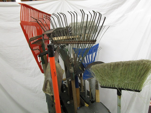 House and garden tools with organizer rack. Includes Industrial super shovel with sharp cutting teeth by Seymour quality tools, assorted rakes and shovels with push broom and sweeper broom along with pickaxe and edging tools. Also comes with axes and sledgehammers. All in good usable condition, please preview.
