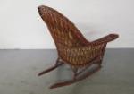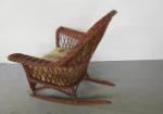 This antique wicker rocking chair features open weave lattice style work, flared arms and a high arched back. This chair has an upholstered back and matching seat cushion. This item measures 32-1/2"W X 33-1/2"D X 37"H. This chair has damage to the cushion as shown in the photos. It is in previously owned condition. Please preview.