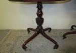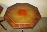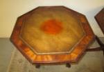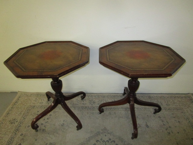 This lovely pair of Regency-style octagon drum tables feature a leather style insert, a single pedestal base with four curved legs, curved feet and casters. These items measure 25-1/2"W X 25-1/2"D X 29"H. There is some staining and crackling to the top surface as shown in the photos. These items are in previously owned condition. Please preview.