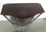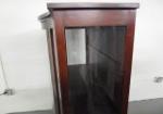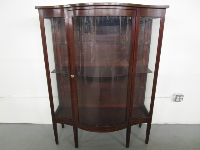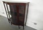 This beautiful antique curved glass, mahogany display/curio cabinet features two wooden shelves and a crystal style pull. This cabinet is missing two shelves. Measurements are 60" tall x 46" wide x 20.5" deep. It is in previously owned, good condition. Please preview.