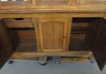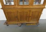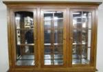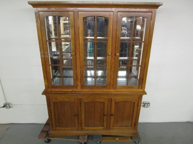 This very nice large, oak Jordon's Furniture glass front China cabinet features a Mission style design, two glass shelves, and a lighted display option. The lights have not been tested and one of the glass panels will need to be reattached (pieces included). This item measures 57-1/2"W X 17"D X 77-1/4"H. This item is in previously owned condition. Please preview.