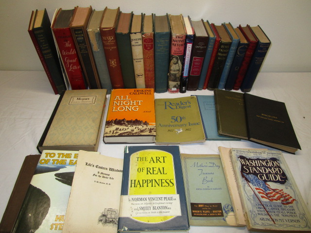 This collection of vintage books features twenty nine hardcover books and four paperback books. Titles include "The Art of Real Happiness", "The Spy", "The Native's Return", "Mary, Queen of Scotland And The Isles" and more. These books are in previously owned condition. Please preview.