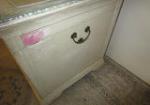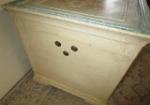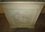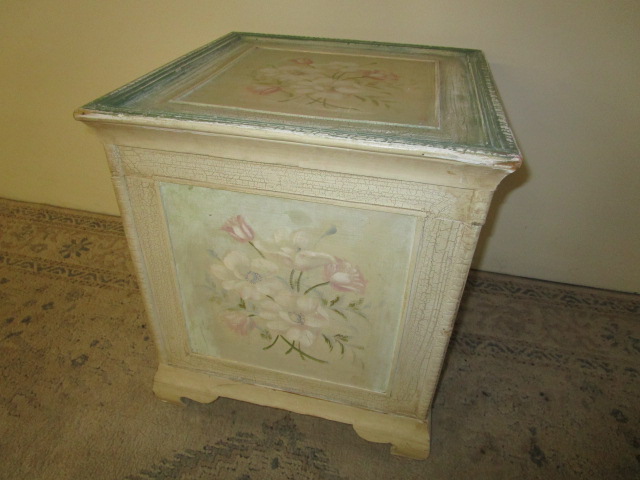 This darling vintage style "shabby chic" storage chest features a floral motif and velvet lining. This item measures 19-1/4"W X 19-1/4"D X 21"H. This piece is missing one handle. It is in previously owned condition. Please preview.