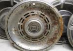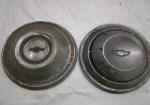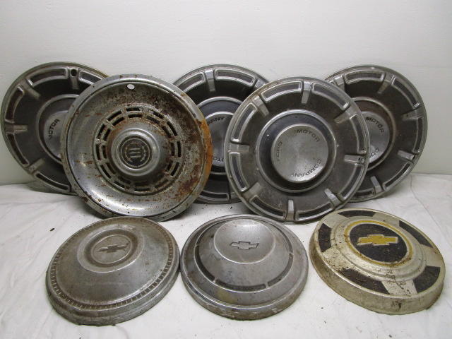 This assortment of eight vintage hub caps includes a set of four 4" "dog dish" wheel covers for a 1970-1972 Ford Maverick, one cover for a 1967 Chevy Impala, Camaro, or Chevy Nova 2, one cover for a Chevy Camino, Camaro and Novas, a 10.5" cover for Chevy trucks or vans and a 14" cover for a Ford LTD. These hub caps are "barn finds". They will need to be cleaned and the Ford LTD cover has some surface rust. Please preview.