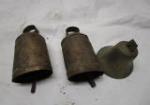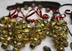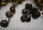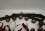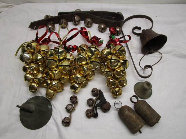 This selection of new and vintage bells includes four strands of new holiday bells, two vintage cow bells, an antique "shop keepers bell" two school bells and a set of sleigh bells. These items are "barn finds" and are in previously owned vintage condition. Some pieces are rusty due to age. Please preview.