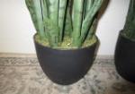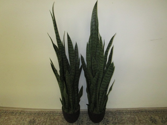 This pair of 14" stylish life-like artificial Sansevieria snake plants in black plastic pots are in new condition. Please preview.