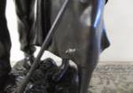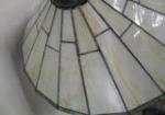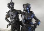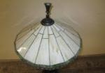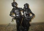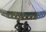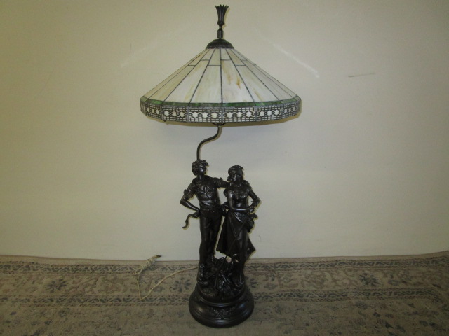 This one of a kind 42" Art Nouveau-style figural table lamp features a detailed sculpture of a man and maiden possibly identified as the "Shepherd Boy and Girl". This table lamp is topped with a gorgeous Tiffany-style stained glass shade featuring a geometric design. This lamp has been tested and does power up. It is in previously owned condition. Please preview.