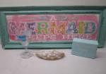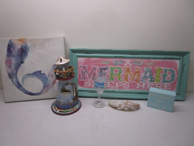 This adorable selection of mermaid related room decor pieces include a 27" X 11" pastel "A Mermaid Sleeps Here" sign, a 14" X 14" pastel mermaid tail print on canvas, an 11" Heather Goldmic lighthouse/mermaid tea light holder, a 5" X 4" "Mermaids Have More Fun" sign, a "Be Mermazing" wine glass and a carved abalone shell. These items are in new and previously owned, good condition. Please preview.