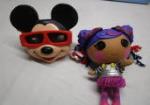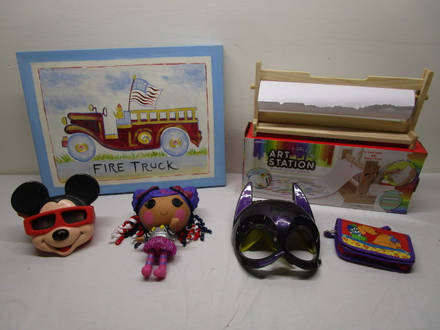 This assortment of child related items includes a 17" X 13" Pottery Barn painting of a fire truck on canvas, a vintage Mickey Mouse View Master, a Mattel DC Super Hero Batgirl mask, a Lalaloopsy Littles doll, a Winnie the Pooh wallet and a Table top Art Station with a partial roll of paper. These items are in previously owned condition. Please preview.