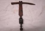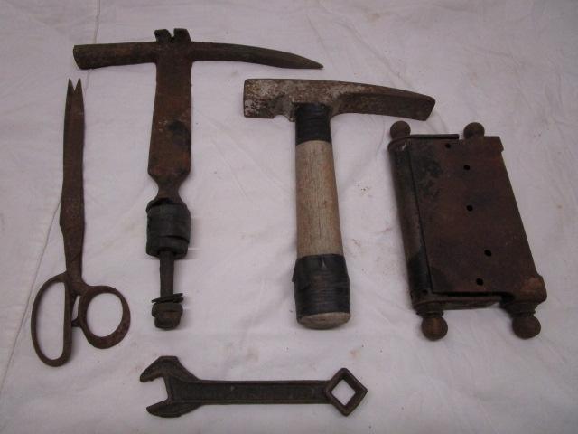 This assortment of vintage tools includes a slate/roofing hammer, a pair of iron shears, a masonry hammer, a double-action hinge, and a wrench. These items are "Barn Finds" and are in previously owned condition. They have rust due to age. Please preview.