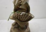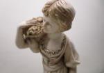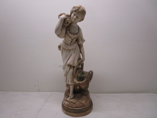 This lovely 20" vintage Marwal style chalkware statue depicts a young girl carrying a basket. This item does have some chipping as noted in photo # 3. This statue is in previously owned condition. Please preview.