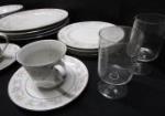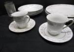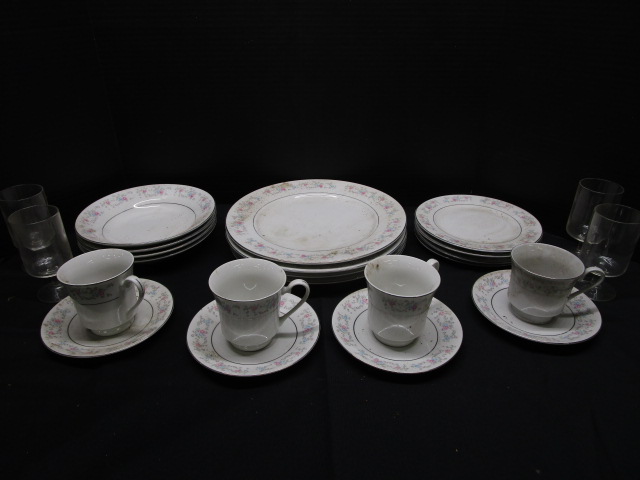 This partial set of "Dynasty" dinnerware includes four 10" plates, four 7-1/2" salad plates, four 8" bowls, four tea cups and four saucers. This set is in previously owned condition. Please preview.
