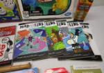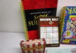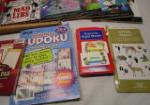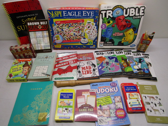 This nice assortment of over twenty entertainment items includes "Mad Lib" books, "Sudoku" books, a mini "Tumbling Tower" game, a "Trouble" board game and more. These items are in new and previously owned condition. Please preview.