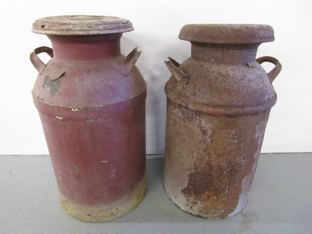 This pair of antique 24" milk cans with lids are "barn finds" and are in weathered condition with some rust and patina. Please preview.