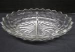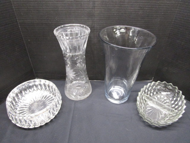 This Assortment of four beautiful pieces of vintage glassware includes a Fosteria "American" divided bowl, a 12" Rivera flared vase, a 7-1/2" Gorham Althea style crystal bowl and a 12" vintage cut crystal vase featuring etched starburst design. The crystal bowl was given as an award and is engraved with the recipient's information on the base(as shown in photo #4). These items are in previously owned, good condition. Please preview.