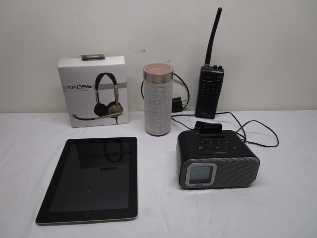 This assortment of five electronic products includes an IHome Blue Tooth radio alarm clock (model # iBT-22), a pair of Koss (model # C100) gaming head phones, a Radio Shack 16 channel programmable scanner, an iLive platinum wireless smart speaker (model # ISWFV387RGO) and an Apple iPad 32GB.These items are in previously owned condition.The ipad does not have a charger and has a cracked screen. These items have not been tested, they are being sold as is. Please preview.