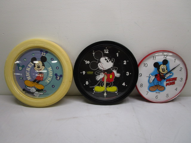 This adorable trio of collectible Mickey Mouse, battery operated, wall clocks are in previously owned condition. The purple and teal item will need repair as the hands are not attached. Please preview.