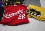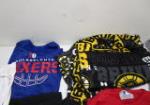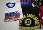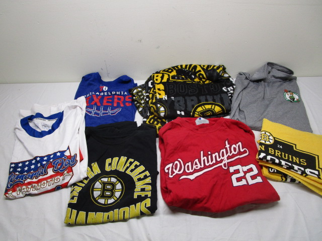 This collection of sports related items includes five sports shirts (a size XL long sleeve Celtics shirt, a size XL Baseball bash t-shirt, an XL Washington shirt, an XL Philadelphia 76s t-shirt, a L Bruins t-shirt), four Bruins rally towels, and a pair of 2XL Bruins fleece pajamas pants. These items are in previously owned condition. Please preview.