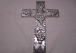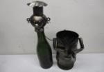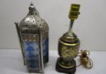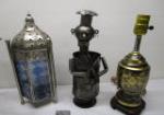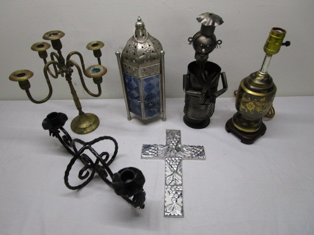 This very nice collection of metal home decor items includes a 13" Indian silver toned and blue glass lacquered candle lantern, a cast metal tapered candle holder, a solid brass candle holder, a silver toned cross embossed with a grape vine motif, a 13" black and gold toned lamp and an interesting 13-1/2" wine bottle holder featuring a "chef" style design. These items are in previously owned condition. Please preview.
