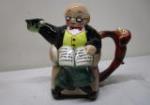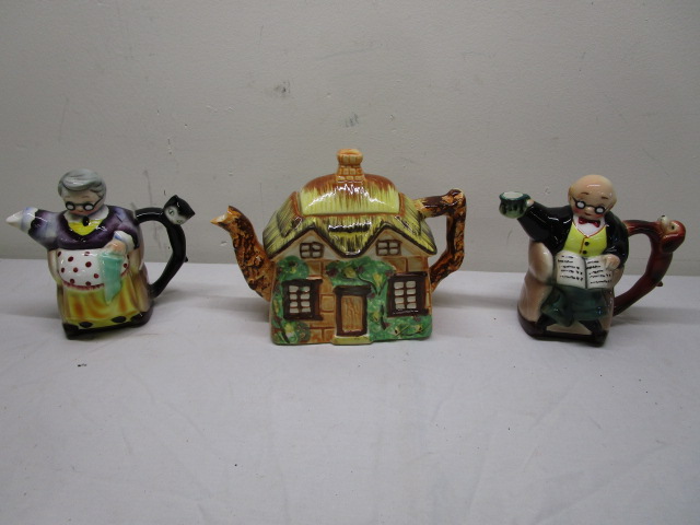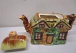 This adorable English Nippon porcelain hand painted ceramic figural tea pot set features a cottage style tea pot and "old woman and old man creamers (featuring cat and dog handles). These items are in previously owned, good condition. Please preview.