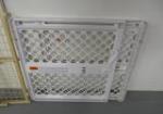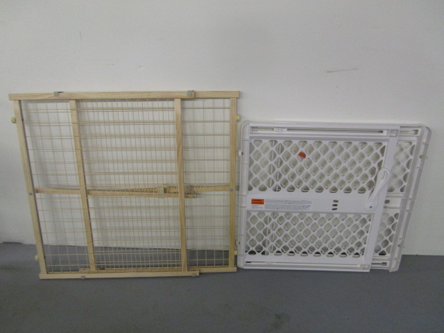 This pair of baby gates include an FDO heavy duty plastic gate (model # 861X) and an Even Flo wooden baby gate. These items are in previously owned condition. Please preview.