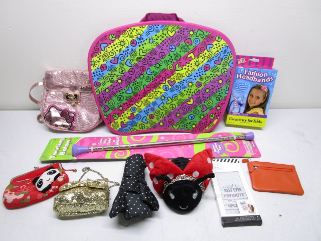 This assortment of accessories for young girls including purses, wallets, head bands and more. Also included is a new twirling baton. These items are in new and previously owned, good condition. Please preview.