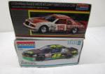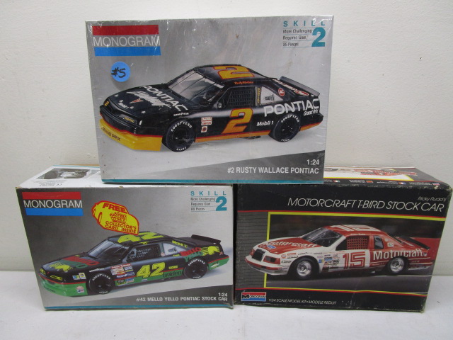 This Trio of 1:24 scale Monogram NASCAR model car kits includes a #2 Pontiac Excitement Grand Prix driven by Rusty Wallace, a # 42 Mello Yello Pontiac driven by Kyle Perry, and a #15 Motorcraft Ford Thunderbird driven by Morgan Sheperd. These items are in new condition in opened boxes. The boxes are worn due to storage. Please preview.