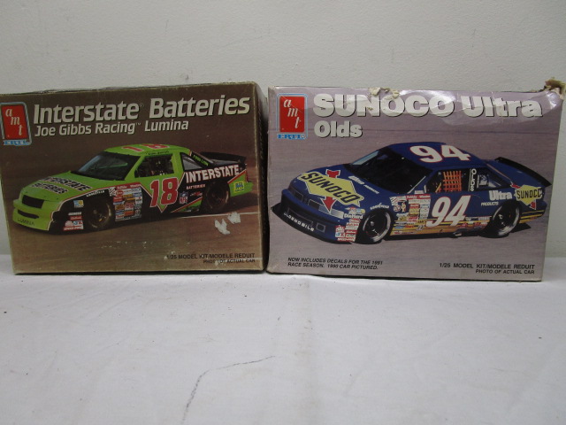 This pair of vintage AMT/ERTL 1:25 scale NASCAR plastic model kit featuring a #18 Interstate Batteries Chevy Lumina (model # 8752) driven by Dale Jarrett for Joe Gibbs Racing and a #94 Sunoco Ultra Oldsmobile (model # 6738) driven by Sterling Marlin. These items are in new condition in opened boxes. The boxes are worn due to storage. Please preview.