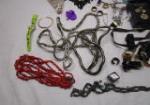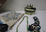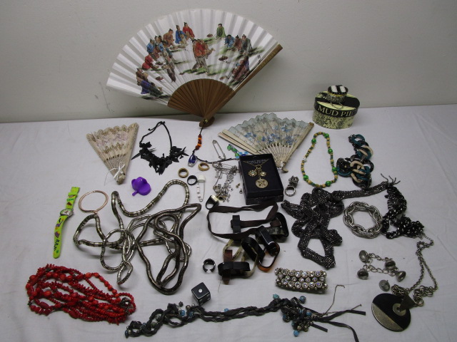 This nice collection of vintage costume jewelry and accessories includes fans, rings, necklaces and more. These items are in previously owned, good condition. Please preview.