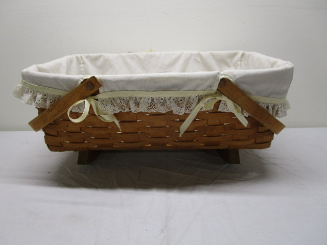 This sweet 19"L X 13"W X 8"H hand woven, signed, lined Longaberger basket (on rockers) is in previously owned, good condition. Please preview.
