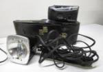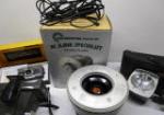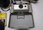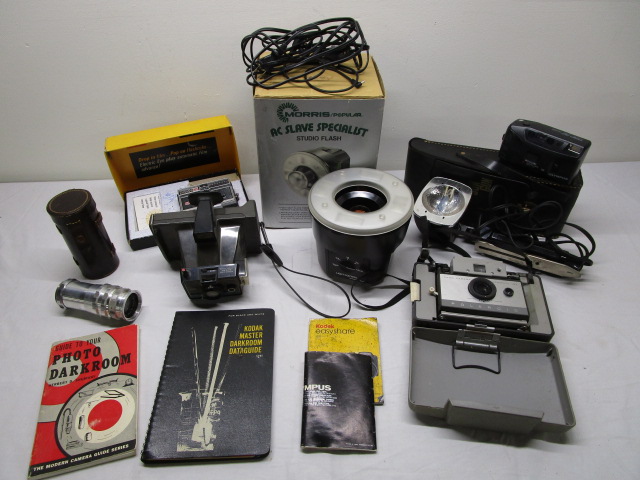 Box lot of vintage photography equipment which includes a Morris AC Slave Specialist Studio Flash with original box, a Kodak Instamatic 404 No. A404R, a Polaroid Colorpack II Land Camera, a Sun Gun II movie light with case, and so much more. This equipment has not been tested. Please preview.