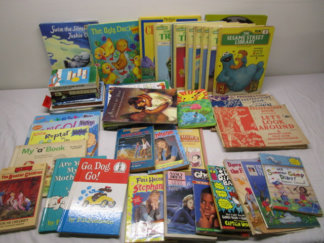 This box of books includes books from the Sesame Street Treasury from the 1980's, Rugrats books, Captain Underpants, Nancy Drew, and many more. These books are in used, good condition. Please preview.