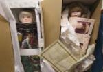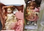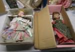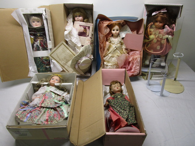 Large box of vintage dolls including a Madame Alexander Lucy Hayes from the First Ladies of the US Series, a Roseybell Patchwork Princess doll, a Marian Yu Designs porcelain doll and more. These dolls come in their original boxes which have some wear. Also comes with 3 extra doll stands. Please preview.